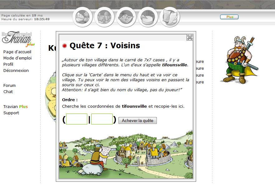 Pour vous accompagner lors de vos premiers pas dans Travian, un Avatar nommé « Maître des Quêtes » est là pour vous aider. Il vous donne un certain nombre de quêtes diverses et variées afin de vous familiariser avec le site. Mais attendez-vous à ce que le Maître des Quêtes vous abandonne d'un Instant à l'autre.